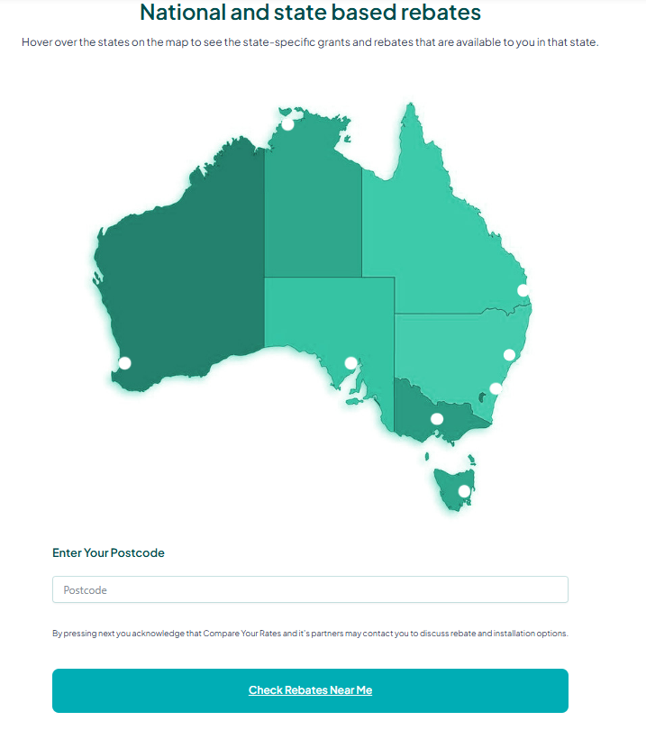 Disclaimer: Compare Your Rates is a free service connecting Australian households with energy solutions and verified installers. Rebate availability, values, and eligibility criteria are set by government programmes and change regularly. While we maintain the most current database possible, always verify rebate details directly with installers and programme administrators before proceeding. Individual rebate eligibility depends on specific circumstances, location, and programme funding availability. We are not a government agency and do not administer rebate programmes.